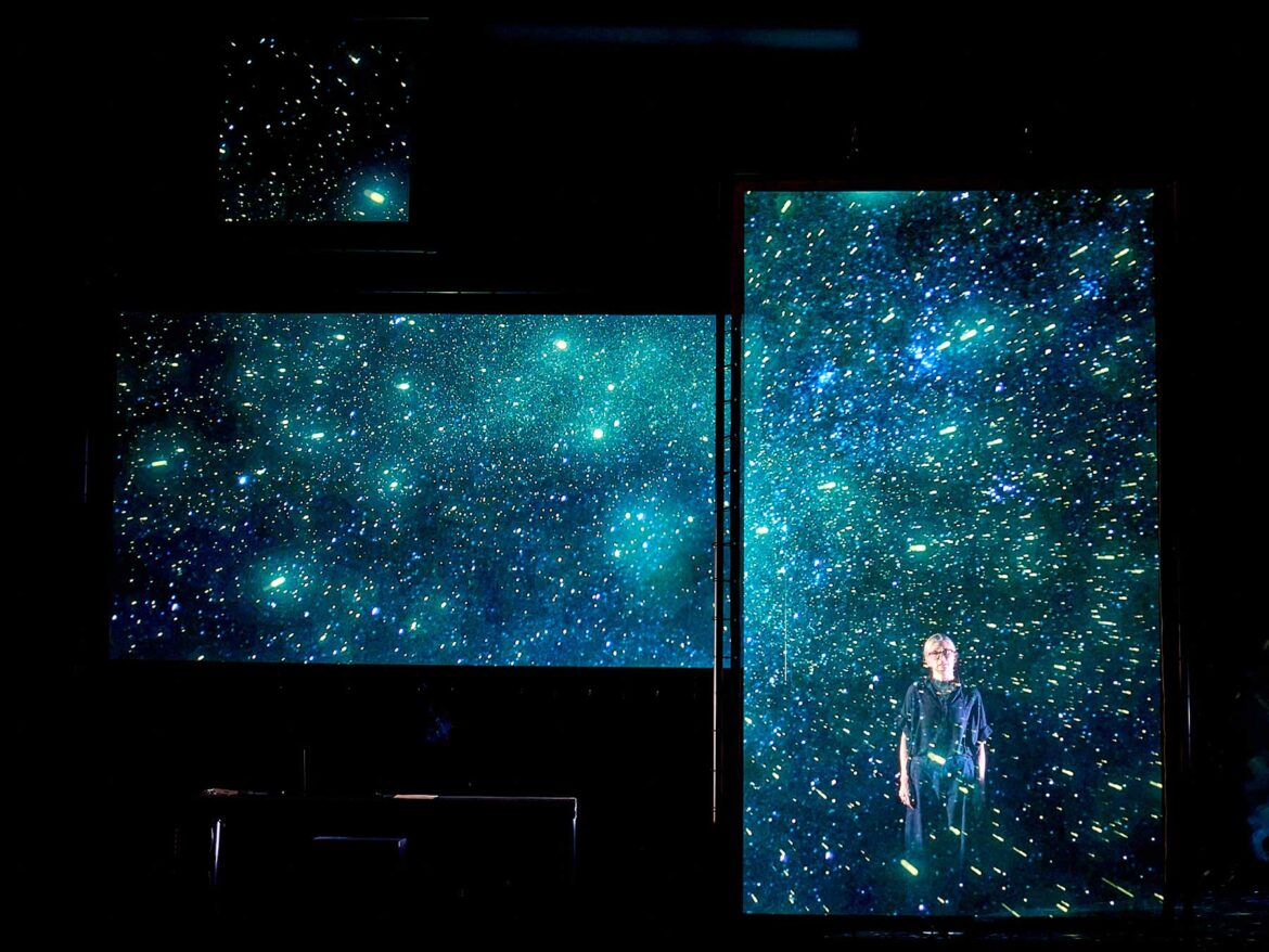 Creative technologist and designer Derek Richards has crafted a nest of temporal mirrors and trompes d’oeil down rabbit-holes of autobiography, with filming and camera switches. There’s some bewitching effects later from image director Majid Kashani: one with trees shedding autumn sycamores across to another screen where nebulae spiral. It’s slanted into the sense of now with Jackie Shemesh’s lighting; and Anna Clock’s sound and composition wrapping a warm hug around what might seem detached and chilled. The back-up team is hefty.