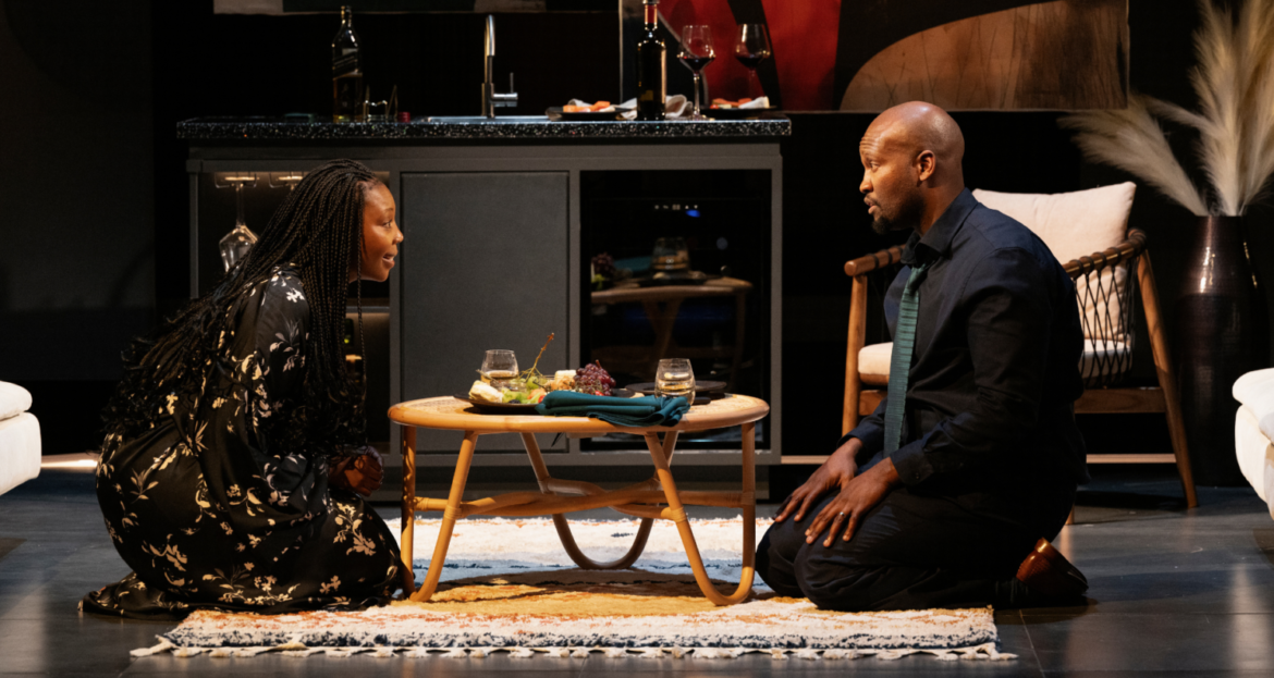ULTZ’s set foregrounds different living rooms with descending artwork, smart for Bonolo’s taste, and more minimal for Jess and Andrew’s. It’s at the latter’s we see the colourful shack, both built (comically a satellite dish is mentioned and one appears) and dismantled. Chris Davey’s lighting gradates the interiors these couples enjoy, and invokes the shack’s chimeric distance. Femi Temowo’s music with its memorable instrumentation sashays through the plot; in Elena Pena’s sound it’s pinpoint but not overwhelming. There are though other sounds off. With the spectral and timeless also invoked by paring the Epilogue’s text, so instead of being previous, it becomes a no-time continuum in Lynette’s final speech.