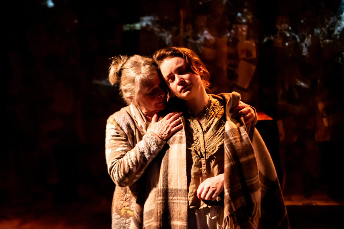 Newcomer Zoe Goriely as Miriam’s younger self responds to Jasmin Colangelo’s movement direction with fantastically dextrous yoga bends and leaps. Narrating Miriam’s younger self – called Eva to fruitlessly disguise her Jewish identity – she takes up Gruber’s gentle authority, and accelerates. Sprinting almost off the stage, scudding to a halt, Goriely spins out a breathless, vehement child’s view. There’s eagerness, bewilderment and terror. Goriely starts wide-eyed. “What colour eyes you have doesn’t matter to me. Does it have to matter to you?” Eva tries washing out her black eyes with soap till they get “flamed”.