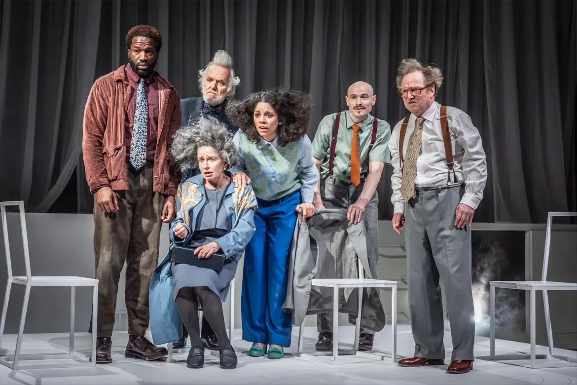 Elerian’s deeply serious about fun, and whatever Ionesco might have thought, there’s clearly funny bones in the piece: not for nothing did it inspire the 2008 dystopic farce film Zombie Strippers. Elerian’s though is a take on the play to reckon with. And with Ana Inés Jabares-Pita set of clinical white, often dominated by the cast as equally squeaky-looking scientists, it’s hardly surprising the central character Berenger (Ṣọpẹ́ Dìrísù) presents as a tabula rasa himself. Till near the end.