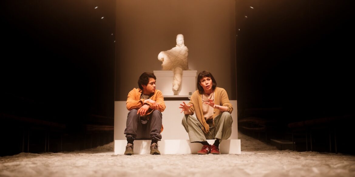 T K Hay’s set features a statue plinthed in an alcove at one end of the Upstairs in traverse. There’s a small rectangular pond below it in the second act, where some actors are uncomfortably placed. And for two scenes actors appear on a large screen interacting with someone on stage. Alex Fernandes’ lighting in particular sculpts and throws scenes with light: flames, raves, spotlit museum plinths, searchlights roving in pitch dark. Patch Middleton’s sound evoking all these scenes also scoops out an eerie envelope, and the fright of time.