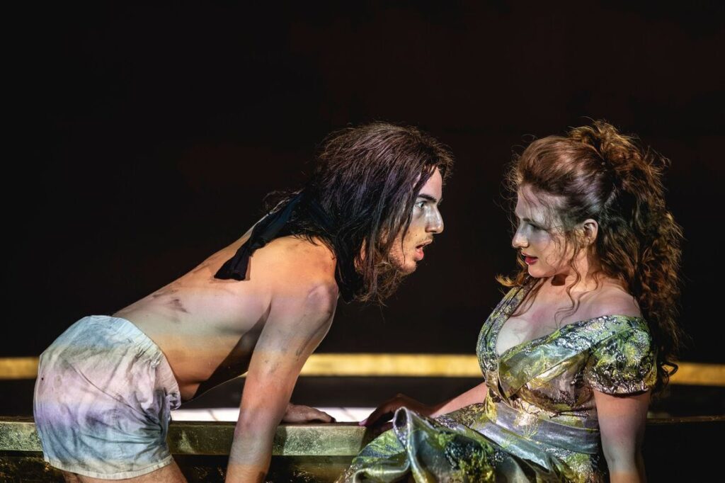 This hinges on the use of language throughout and a few key roles. Difficult language is delivered awkwardly (sometimes badly) by secondary characters, something only heightened by the fluency of the eponymous lead who sounds British, which she isn’t. Gesher regular Neta Roth is both dismissive and cruelly oblivious as Salomé, recalling how closely she parallels the princess in Wilde’s story The Birthday of the Infanta (also published in 1891). There’s more Infanta than seducer in Roth’s portrayal and that’s valid, though chemistry between her and most of the cast is somewhere at minus 273. That’s save briefly with Salomé’s mother Herodias (a striking and assured Lena Frafield, full of disdain). Her embrace discharges the lightning of adolescence teetering on womanhood, the desire for love and approval not from men, but her mother. With one partial exception, Jokanaan.