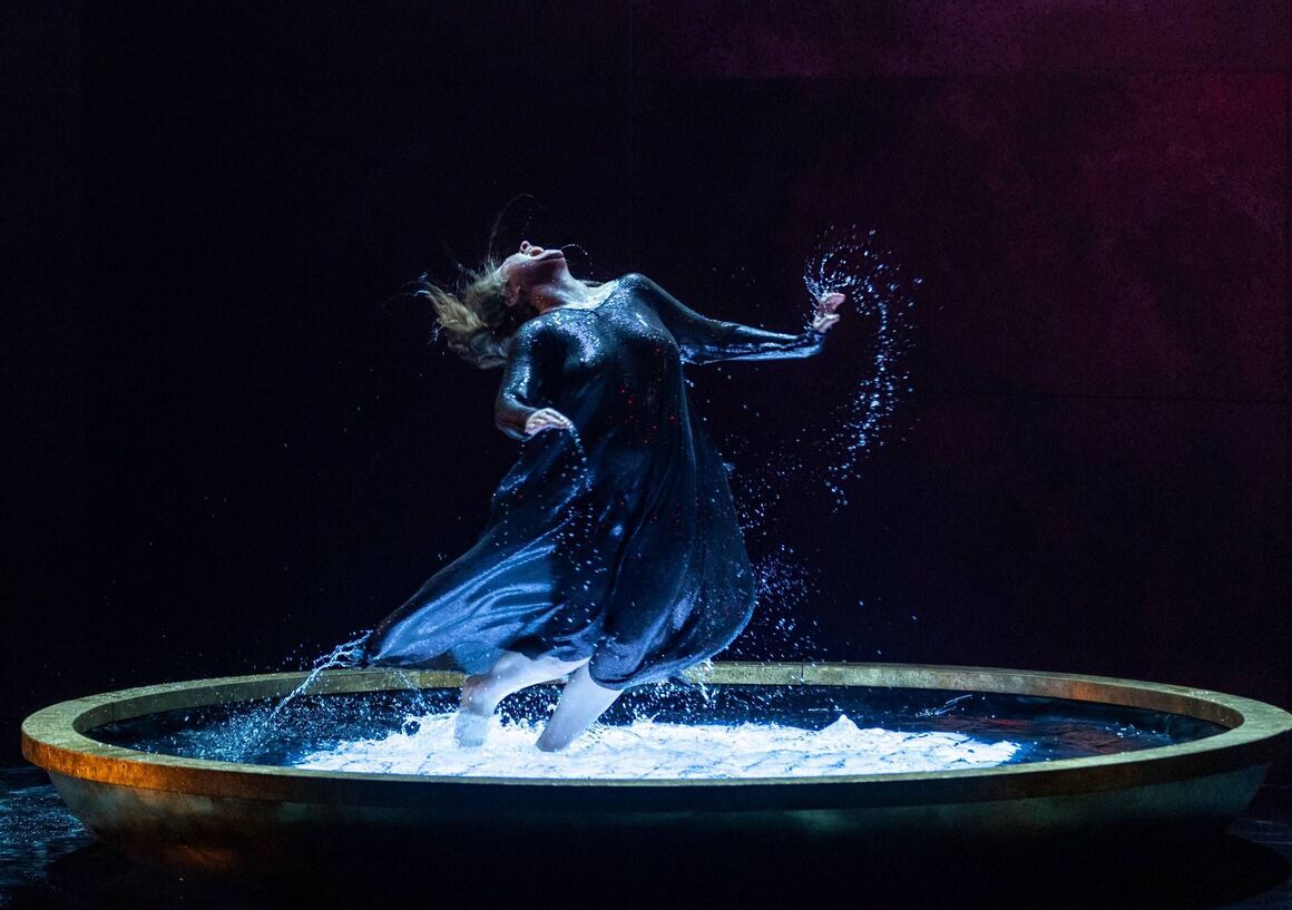 Galya Solodovnikova’s gorgeous set like a Dubai hotel isn’t the first to essay modern décor and modern dress: Daria Dontzova’s mainly dark creations culminate in much diaphanous lame for Salomé. No-one could possibly accuse Wilde’s quasi-biblical drama of naturalism, and the rich burgundies and golds centred by a wide shallow gilt bowl for people to slosh in is a recurrent feature of indulgent theatrics seen everywhere; even the diminutive Wanamaker in their 2022 Hamlet. Floors and pillars gleam, luxury pulses. The reveal on Jokanaan’s glass box cell which opens upstage to deep reds and shutters down, is a striking way to get round sightline issues: the cistern he’s nominally confined to in the cellarage. There Jokanaan (Shir Sayag) stands near-naked against that red in baroque chiaroscuro. It’s pure Caravaggio, who painted the story’s denouement. Caravaggio would have recognised (and probably celebrated) the performative cruelty in this cell that normalises torture and incarceration in a chilling way. It’s too contemporary to miss. Here the luxury of violence meets the violence of luxury. If there’s a critique of this world, it lies there.