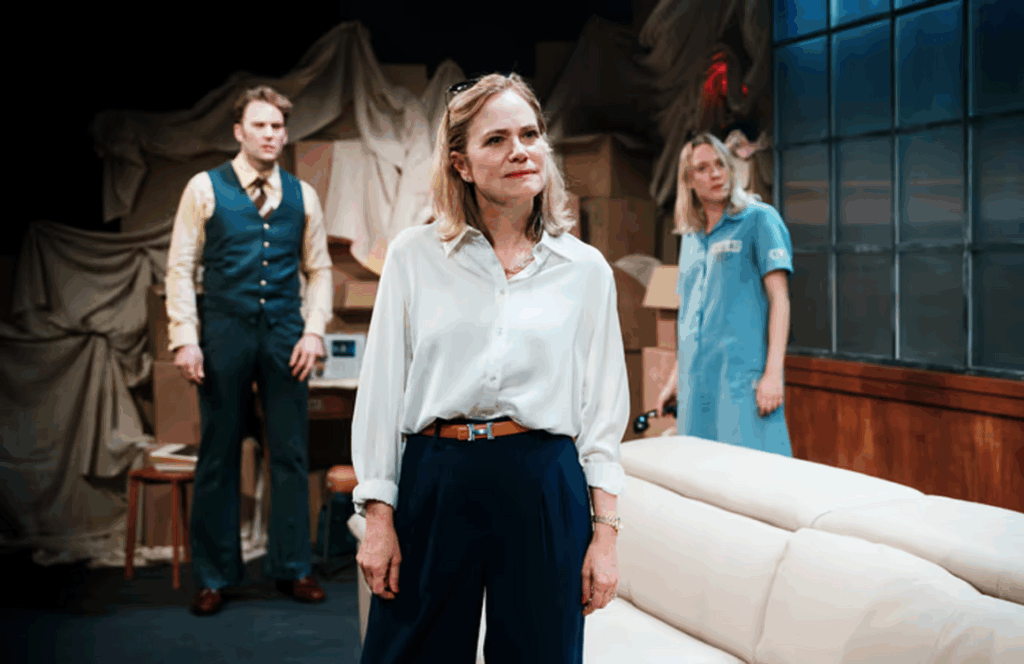 Alternating between early 2017 and 1978 in nine scenes, two sets of actors alternate for seven of them. Abigail Cruttenden (Holly) and Nathaniel Parker (Robert) stand off over that “rare” cream (“beige”) sofa, taking a huge central space in Ceci Calf’s set. It’s surrounded almost entirely by boxes as Robert prepares to downsize. There’s a bare chair and stool if anyone wants to sit. It’s different in 1978, as Ben Lamb (The Lawyer) and Katie Matsell (The Heiress), younger versions of Robert and Holly, by turns shuffle through cosy and stand-offish. Moar also mixes up one or two sequences. So we’re introduced to a Christmas crackers pull (a Scottish grandmother’s influence, clearly no Calvinist); then an uneasy first meeting also in 1978, after another stint in 2017. In Tom Paris’ costumes the 2017 couple are more casual than smart; in 1978 Robert’s snap-smart royal-blue suit contrasts with the heiress’s airmail blue, her numbered prison garb. Steadily lit by Jamie Platt there’s eerie pauses. Lex Kosanke’s music and sound though doesn’t spell out forty years of music between: things remain frozen.