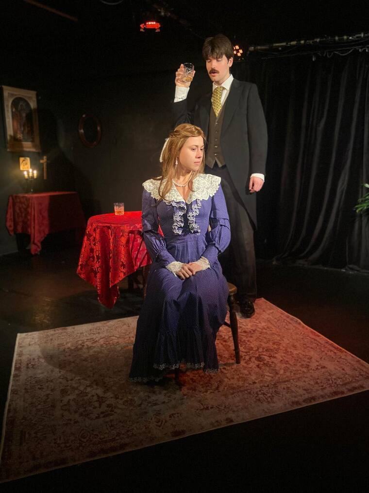 It’s 1875. A contained young man Thompson, sits at his table in an immaculately evoked 1870s interior, himself coiffed in impressive costumery and make-up: long frock-coats, a period dress and make-up are impressive, suggesting more a good run than three short theatre-stops. This time the downstairs Lantern is impressively lit by Eddisford and Erin Buckridge; dimmed at the point the candles become effective, and with a plush vermillion interior.