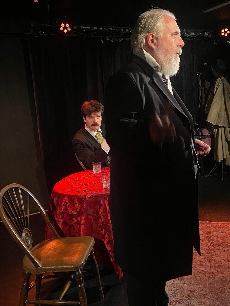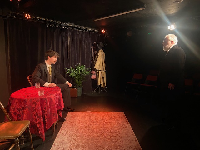 After the rainswept Man arrives, blustery and receiving distinct initial hostility from Thompson, these two favourite London spiritualist Mediums sit, bolt up and wheel about with brandies (realistic for once) waiting for a séance to begin. One smokes. The other drinks more whilst perpetually offering the other: a displacement worthy of ‘The Walrus and the Carpenter’. But not everything is right… at least to the Man. Kate his fiancée, whom he had briefly put off marrying this coming June, arrived and left before he came. She’s apparently ditched him. Well she never believed, says Thompson, and the Man admits he was clearly giving himself to spiritualism over Kate every time. Thompson suggests the Man move in with him.