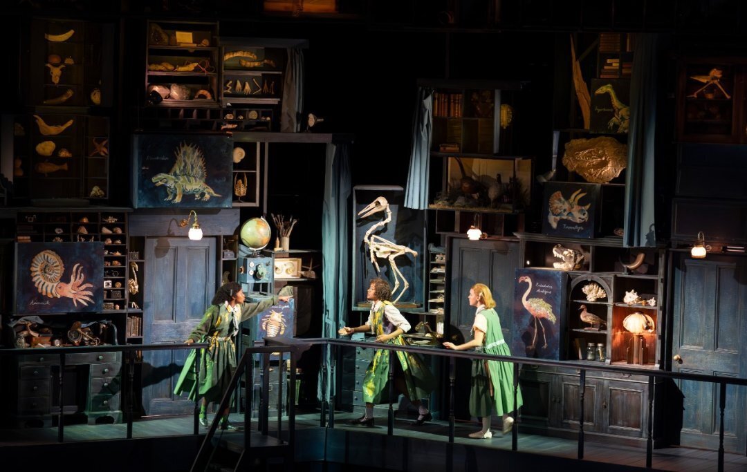 Feaver and Rudd still sweep everything in a storytelling fluidity that takes in Frankie Bradshaw’s set towering with a gallery behind and Gum’s bewitching glass-cabineted fossils, rearing up and crossing above (perhaps more light-dimmed this time). And they move. That’s Ash J Woodward’s video design that projects magically, rippling an ocean on a canvas sheet, props that float across the set. It’s mesmerisingly synched with Paule Constable’s lighting, arctic-blue and midnight at the same tme. At one moment a solidity of bedroom or bathroom, at another a Mad Hatter’s Tea Party as Pauline’s temper means she might miss out on being Alice.