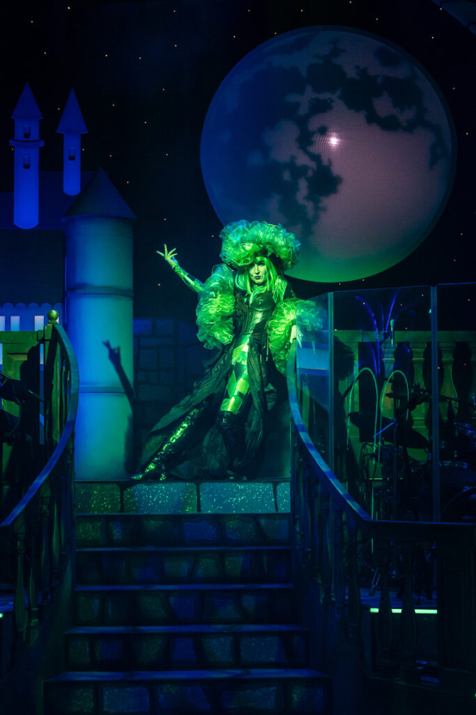After the interval Snarlina’s regretting her leniency. And Beast wibbles between splenetic punishment and a hint from bass guitarist and stone-magiced courtier Jacques Le Plop (a limber and sparky Leo Elso, replacing Myles Miller) that Belle might be…well. Urquhart has to transform a thousand years of spleen into love with – songs. And a dress. Luckily his voice, an ardent tenor-baritone, does the job in ‘I Don’t Belong Here’: an original song. Culture differences turn on how to describe takeaways to a thousand-year-sleeping castle? And there’s a (Norman?) recording studio.