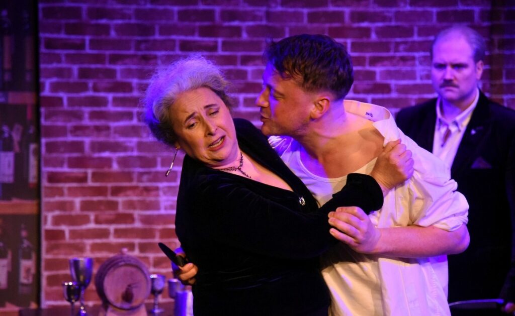 French Princess Alais (Katie Ford who appeared in Albert’s Bridge in Jekyll & Hyde), nurtured years ago by Eleanor, is poised to supplant her: Eleanor doesn’t see her as a threat, yet; and plots for her to marry Richard. All Alais wants is Henry. Anything else – like children – she knows would be snatched away. Ford moves suavely, sometimes passionately, initiating one of two passionate kisses, both with Henry, his other a surprise). Intimacy co-ordinator Elodie Foray makes it look steamy too. Though there’s a twist.