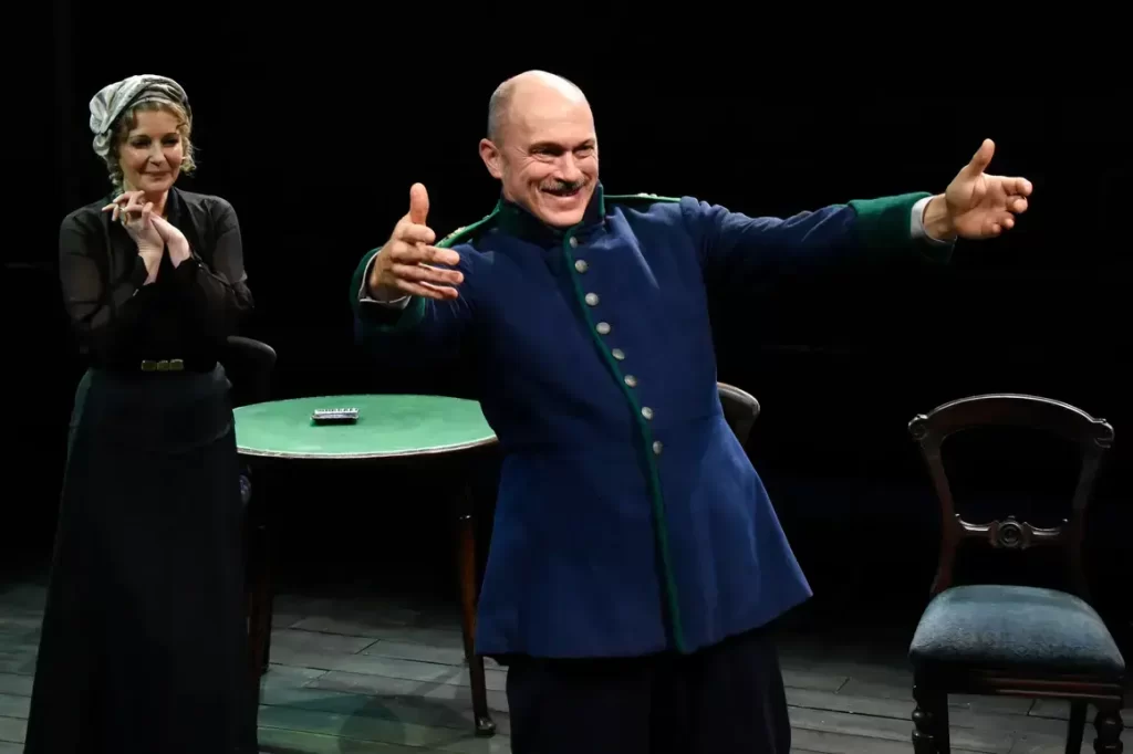 Ashley Martin-Davis’s set of faded eggshell blue-greens gone greyish counters claustrophobically-compressed furniture: including sofas and an all-important telegraph poised on the desk. Props embrace an ever-tapped barometer and wrought-iron hatstand. Martin-Davis’s costume design features a peacock captain’s dress uniform and marginally less dressy one; soft browns and light greys for the visitor and quiet glamour for Alice, often in black. John Leonard’s sound design involves that Boyars’ dance on the piano (played by Tom Attwood) and relatively gentle music upstaged by whirling storms, whistling and banging through.